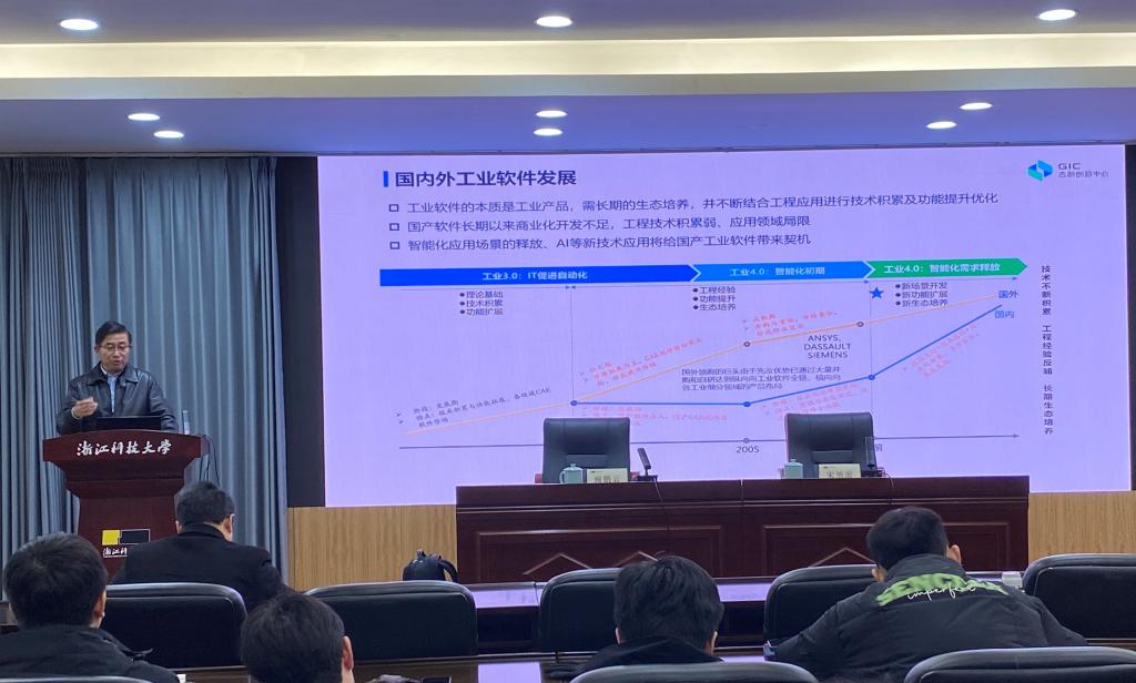 顾鹏云博士作题为“工业软件及AI 技术开发赋能制造业数字化转型”的学术报告。报告中顾博士首先介绍了国内外工业软件的发展概况和挑战,然后详细阐述了AI技术对汽车产品开发设计、虚拟仿真模拟等方面的重要推动作用。报告会后,顾博士和在场的师生围绕AI技术的应用和影响进行了热烈的讨论。