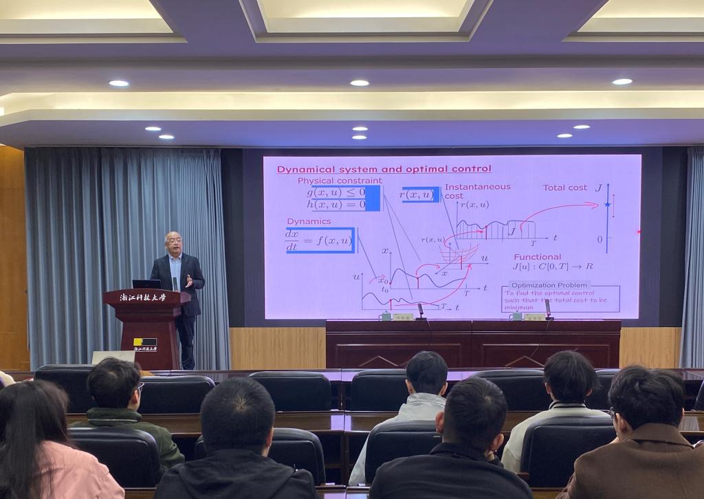 申铁龙教授作题为“大规模智能体群的分布控制与博弈”的学术报告。报告中申教授首先以混合动力汽车为例,简要介绍了动力学系统和最优控制理论,然后对大规模集群的行为与决策问题进行了解析。